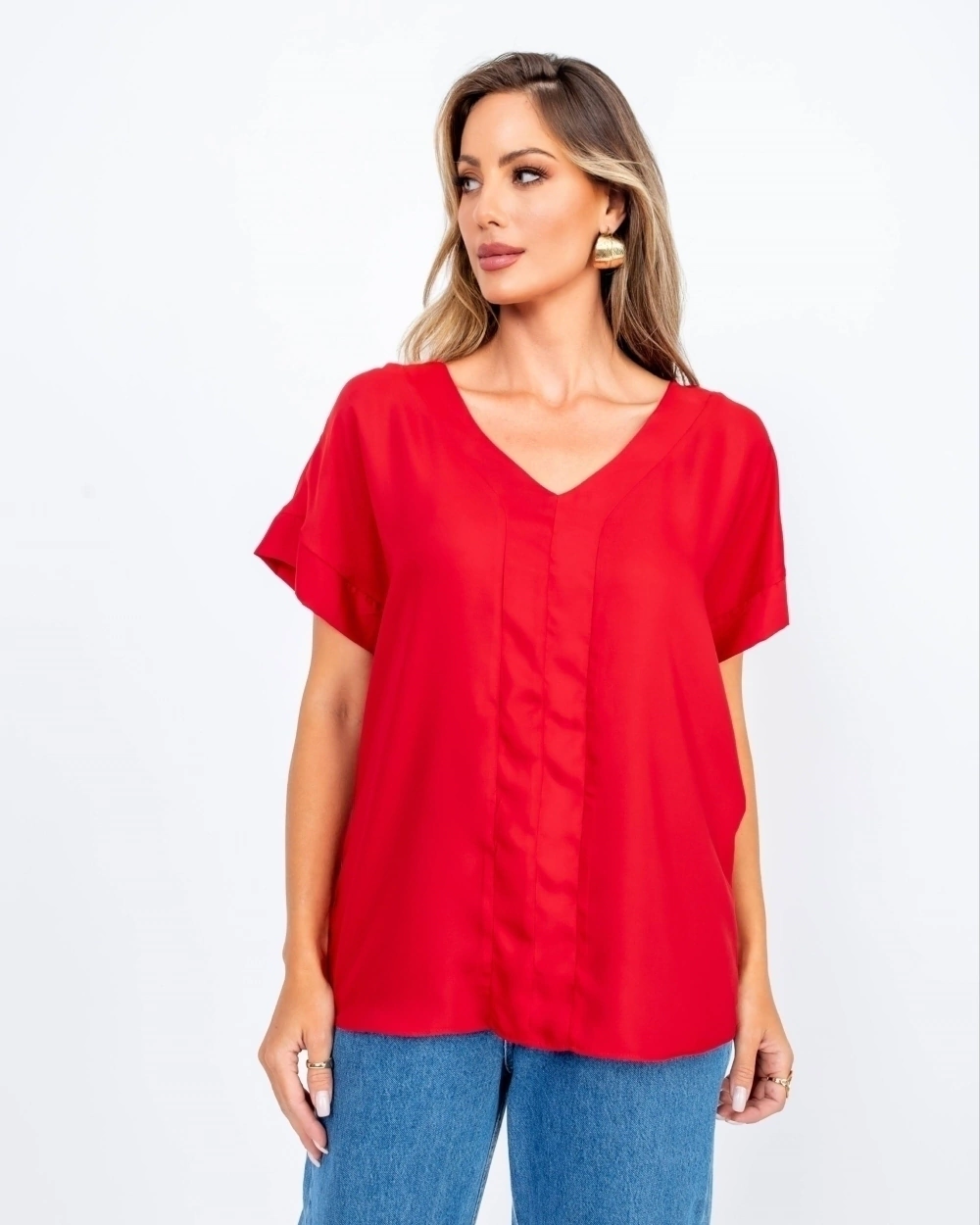 Blusa acetinada de manga curta, com costura frontal e decote em V. Soltinha e leve para o dia-a-dia!