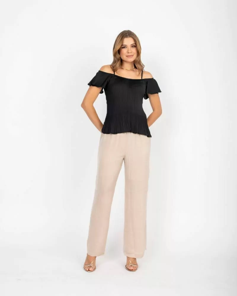 Calça pantalona em tecido fluido e acetinado com cintura alta e cós com elastex. Possui forro interno em malha até as coxas para não marcar. Modelagem ampla, bem maleável e confortável.