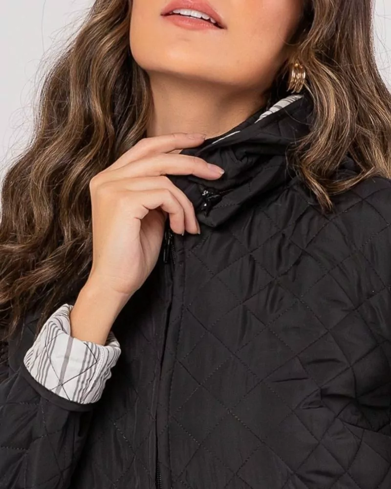 Casaco longo moderno e versátil de matelassê com leve acolchoado, forro interno listrado, fechamento frontal por botões, capuz removível por zíper, manga longa, gola colarinho e bolsos laterais.