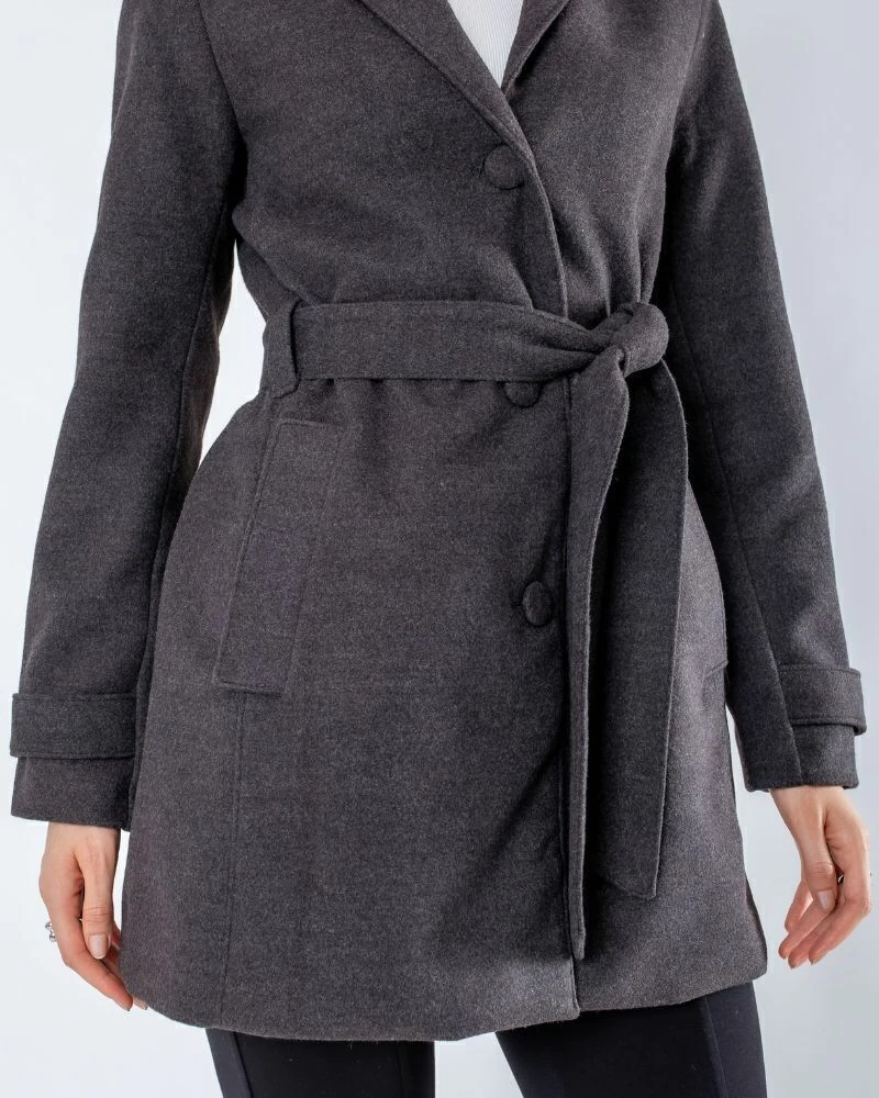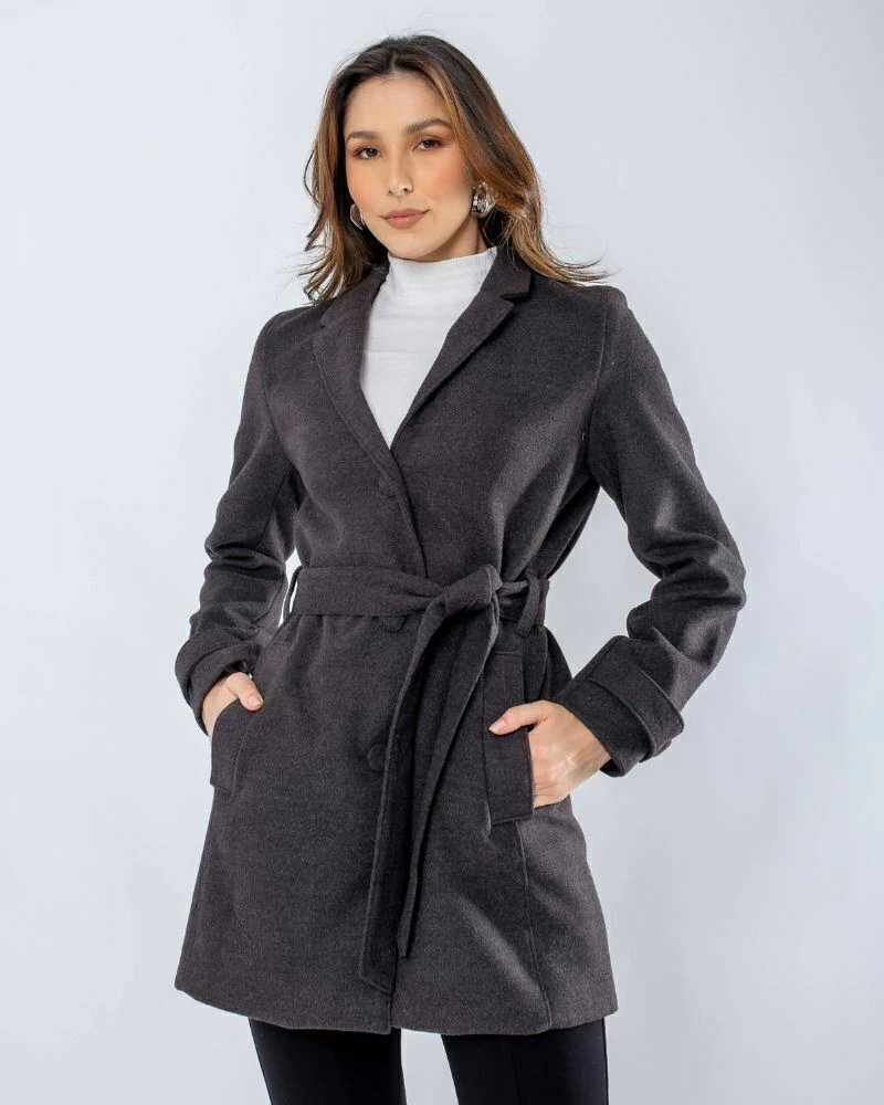 Casaco longo tipo sobretudo de lã batida com forro interno. Confeccionado em tecido encorpado e macio, com o caimento reto e comprimento acima do joelho. Possui o fechamento frontal por botões forrados, gola com lapela, bolsos frontais, detalhe de martingale nos punhos e abertura na parte de trás. Acompanha cinto do mesmo tecido.