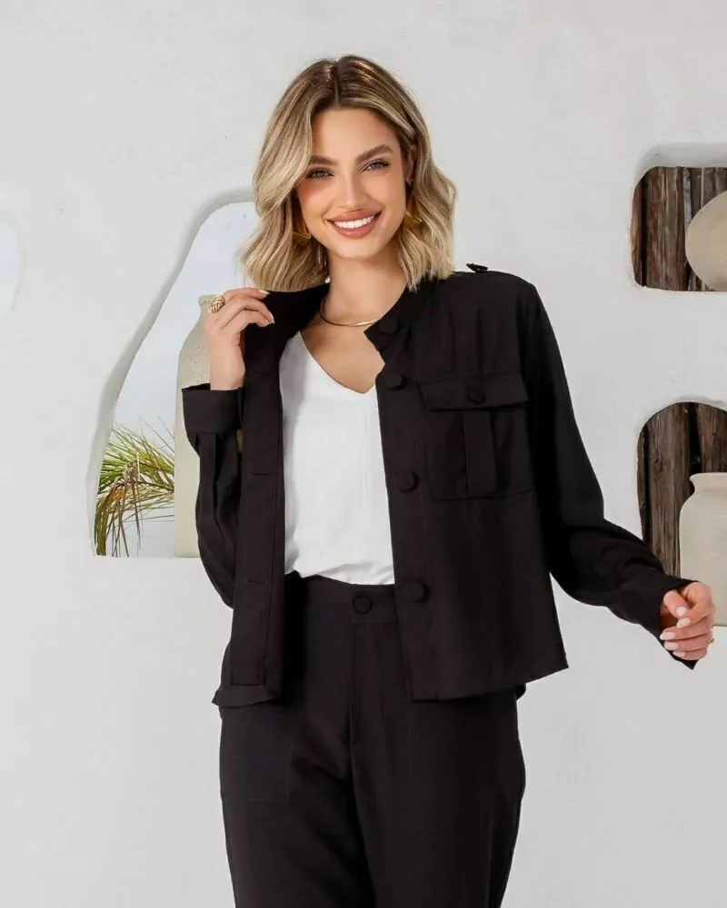 Casaqueto curto em viscose de manga longa, com gola padre e pequenas fendas laterais. Possui botões forrados com o mesmo tecido no fechamento frontal, nos bolsos utilitários, no martingale dos ombros e nos punhos.