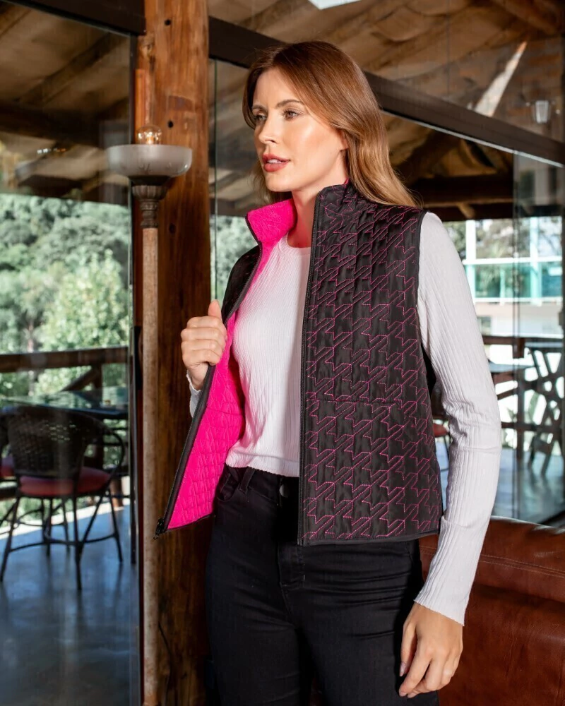 Colete dupla face em matelassê com desenhos em pied de poule, fechamento frontal por zíper emborrachado e cursor reversível, gola alta e bolsos frontais de canguru. Confeccionado com leve acolchoado da manta interna, que garante isolamento térmico em dias mais frios.