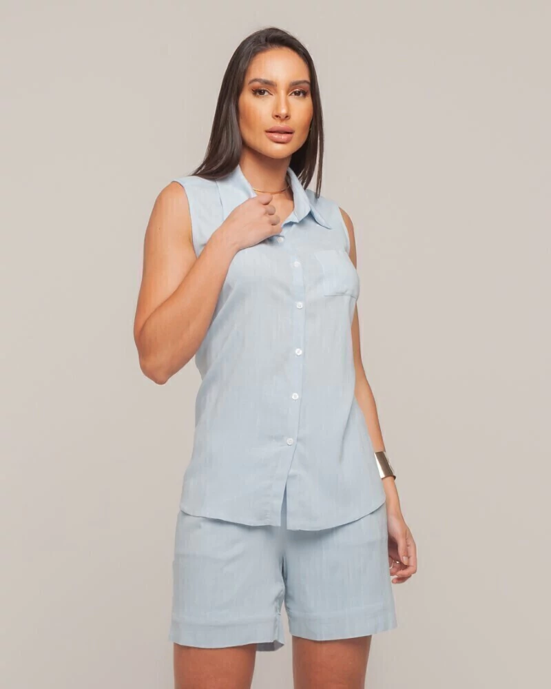 Regata alongada com abertura frontal em botões e um bolso na altura do busto. Feita em tecido viscose leve, confortável e maleável devido ao elastano. Soltinha e mais comprida atrás para compor o look fresco e arrumado. A modelagem dessa peça é reta e bem soltinha.