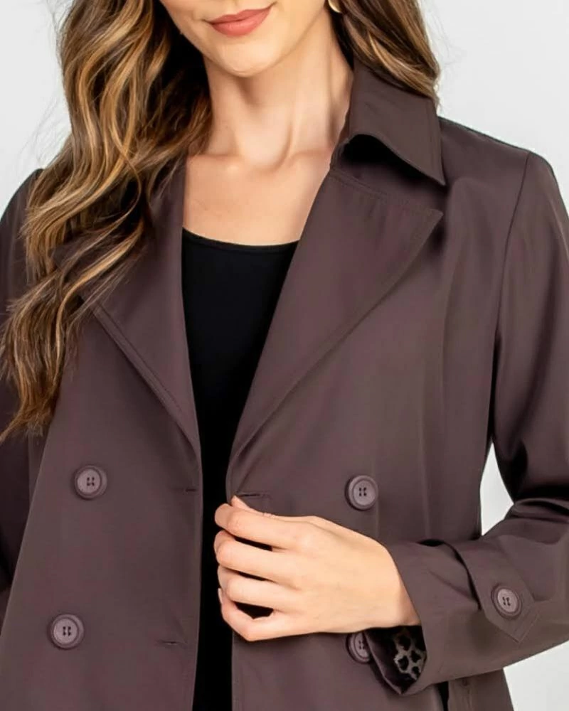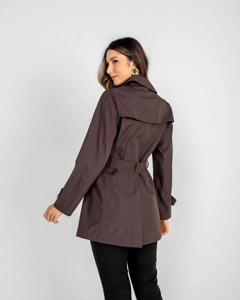Trench coat semi-impermeável com forro interno de onça. Possui o comprimento na altura das coxas, mangas longas, fechamento frontal transpassado com botões e bolsos laterais. Acompanha cinto no mesmo tecido.