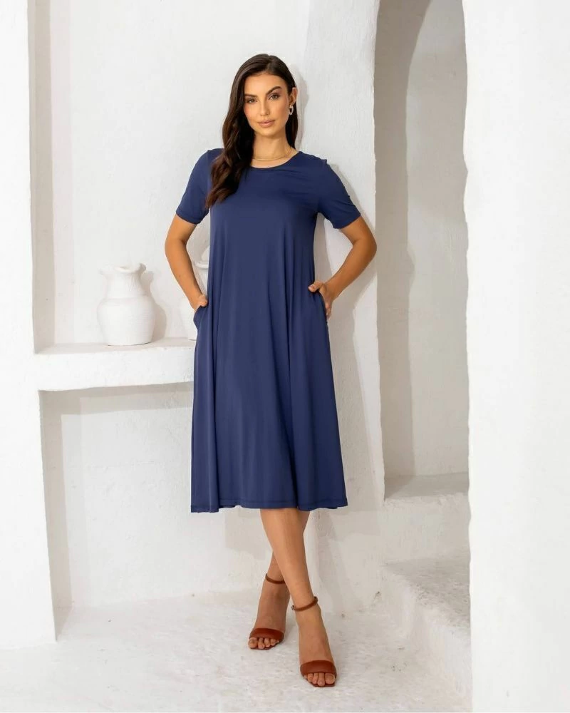 Vestido midi de malha fria lisa Hug SantaConstancia® com a saia em evasê. Possui a modelagem solta, mangas curtas, bolsos laterais embutidos, decote em U na frente e em V nas costas com detalhe de tiras finas cruzadas.
